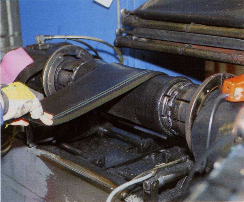 La rete e la mescola (quella preparata per questo uso), passano sovrapposte in un grosso macchinario basato su una serie di rulli, nel quale in sostanza la gomma invade il tessuto che ne resta imprigionato. Al termine del ciclo si formano dei rotoli. Per evitare che i vari strati arrotolati s'incollino tra loro (il tessuto è al centro di ogni strato) in fase d'arrotolamento èinterposto un tessuto di supporto. Interessante la traslazione verso l'alto del gruppo rulli (festone) poco prima del completamento del rullo, che accumula il nastro, in quanto la produzione è continua e non può essere interrotta.