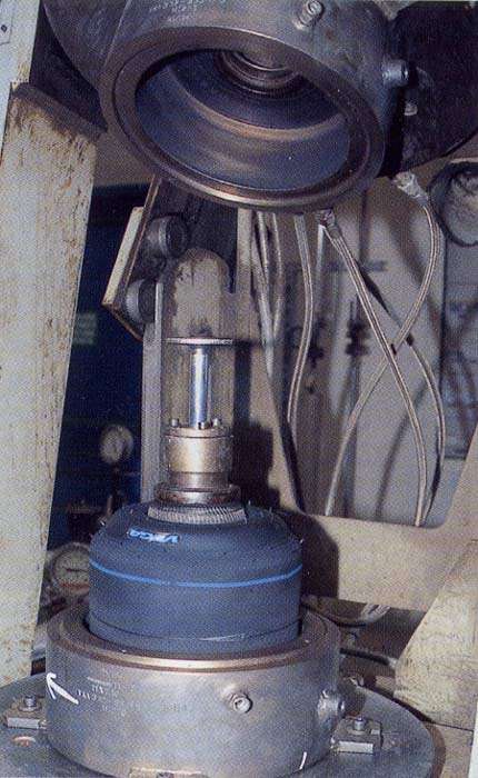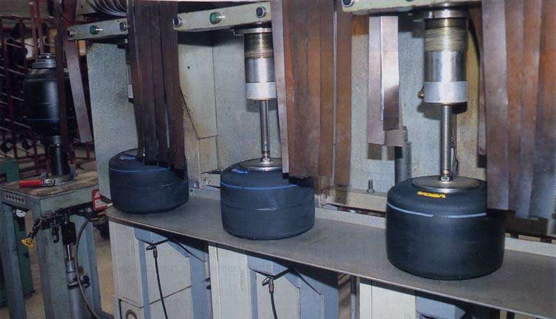 modello di gomma quindi ha il suo stampo. I due semigusci del forno hanno un'intercapedine all'interno della quale circola vapore ad alta temperatura, 160 -170 0C. Nello stesso tempo, dentro Io stampo è riprodotta una pressione variabile da 6 a 8 bar (600 - 800 kPa), secondo il modello e le necessità.